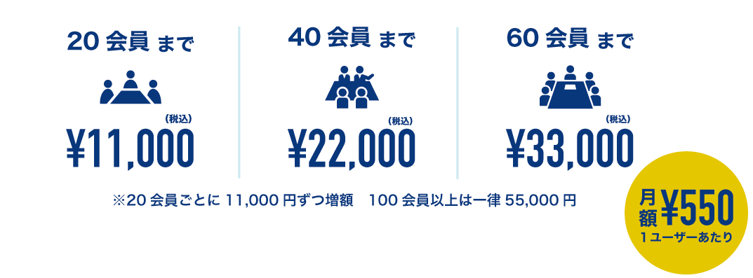 システムプランの費用はとっても手頃で、1万円から始められます。1ユーザーあたり月額550円で、20会員ごとに金額が変動します。