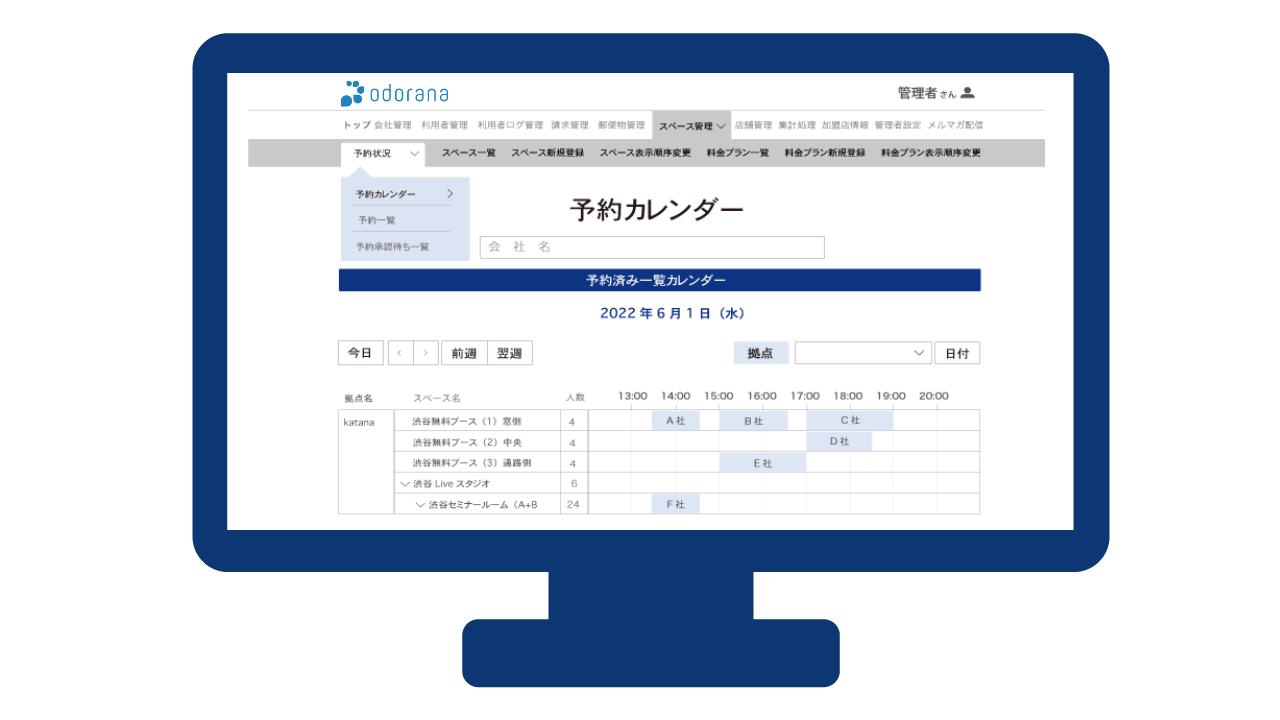 会員(オフィス利用者)データベース管理、受け取った会員様宛の郵便物の管理、入退室ログ管理や、売上高レポートなど管理します。